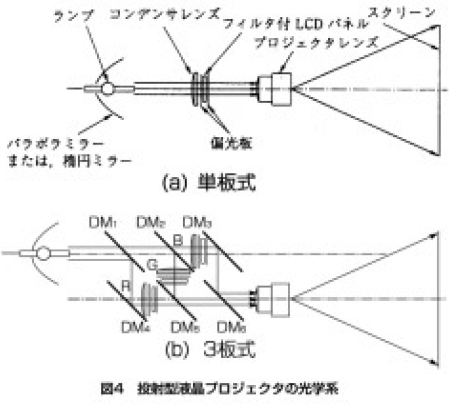 投射型カラーLCDでは,図4に示すように単板式と3板式の2方式がある.いずれもランプからの光は,ミラーまたはレンズにより効率良くLCDパネル面に集められ,投射レンズによりスクリーン上にその像が投影される.