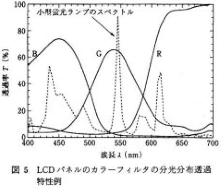 また3節で述べたように,LCDの直視型,投射型にかかわらず,色再現は色分離フィルタの分光透過とランプの発光スペクトルに大きく依存しているので,お互いのマッチングが必要である.さらに,設定白色の色温度に合ったRGB出力の理想的な3波長型光源でない限り,色再現と明るさとはトレードオフの関係にあり,どちらを優先させるかを選択し,バランスをとることが必要である.