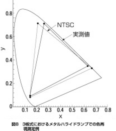 図7に示した色域は,図5のカラーフィルタの分光透過率と図2の各種ランプの発光スペクトルからの単板式を想定した計算例である.ハロゲンランプにおいては,青の領域の発光スペクトルが小さいので効率の良い出力を得るために,緑に近い波長域まで透過する青のカラーフィルタを用いる必要がある.したがって実用上は,青の色域がかなり狭くなる.図8には,メタルハライドランプが使用されている3板式LCDプロジェクタの実測例を示した.この例では,設定色温度でNTSC方式に合った色再現を可能にするために,DMと液晶の制御で緑の出力を抑え,RGBの出力バランスがとられている.