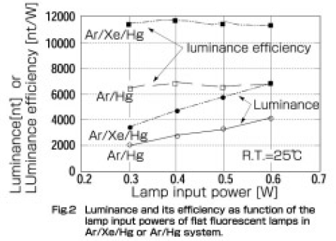 ランプ入力が0.3~0.6Wの範囲内では、Ar/Xe/Hg系及びAr/Hg系で輝度効率に大きな変化は見られなかった。しかしながら、輝度効率に関してはAr/Xe/Hg系がAr/Hg系より高い輝度効率を有する。