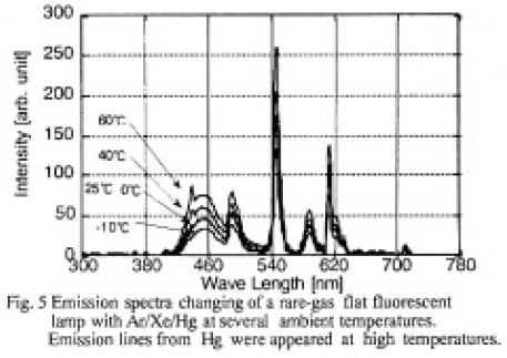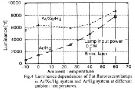 Ar/Hgを主とする従来の小型蛍光ランプは低温での輝度低下、色ずれなどの問題があった。新しく開発した希ガス平面蛍光ランプは、Ar/Xeガスを主に、電極スパッタ防止のためにHgを加えており、低温での輝度、輝度立ち上がり特性及び色ずれが改善された。さらに高温では、水銀からの紫外線の寄与により輝度が増加する効果も得られた。