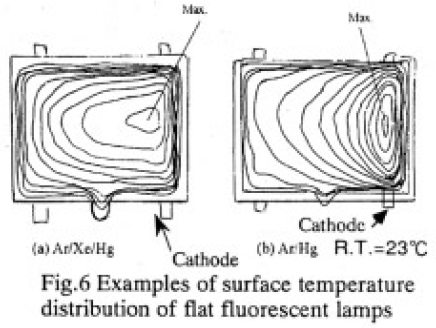 近年、LCDの耐熱特性が向上してきているが、基本的にはランプからの発熱は極力少ないことが望まれている。Fig.6(a)は、サーモビュアーで測定したAr/Xe/Hg系希ガス平面蛍光ランプの表面温度分布である。参考までに(b)は同じ構造のランプについてAr/Hg系の平面蛍光ランプの表面温度分布を付記したものである。Ar/Xe/Hg系ではランプ中央よりやや陰極寄りに最高温度領域があるのに対して、Ar/Hg系では陰極付近が最高温度となっているのがわかる。