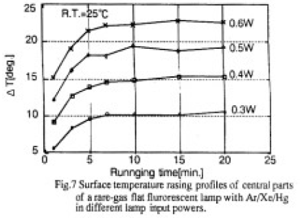 Fig.7は、Ar/Xe/Hg系希ガス平面蛍光ランプについて中央付近の表面温度の時間的推移をランプ入力をパラメータにしてプロットしたものである。入力の増加につれて発熱が増加する傾向を示している。