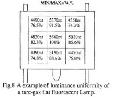 Fig.8にAr/Xe/Hg系希ガス平面蛍光ランプの測定結果の一例を示す。輝度均斉度の向上に有効発光面のガラス表面部をフロストする提案であるが、このフロストは、有効発光面の黒点欠陥対策としても有効である12)13)