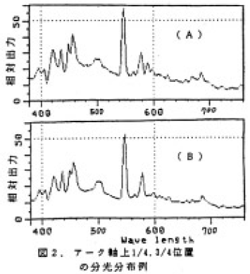 図1は試作ランプの直流点灯時の分光分布(全光)であり、図2(A),(B)はアーク軸上の陰極から1/4,3/4の位置における発光の分光分布である。
