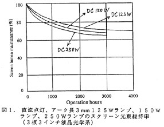 - (a)高管壁負荷の希土類ハロゲン化物入りメタルハライドランプにおける石英管の白濁の発生は希土類元素原子の還元作用に基ずくものと推定されるため(2)希土類元素原子が管壁に付着するのを抑制する手段として、直流点灯を利用するものである。当面はスクリーン光束の低下が寿命原因とならないレベルまで白濁を抑制することが可能になった。アーク長3mmの150Wランプ、250Wランプのスクリーン光束の維持特性を図1に示す(4)。直流点灯方式は初期効率が低いことがデメリットであるが点灯回路が安価になるメリットがある。