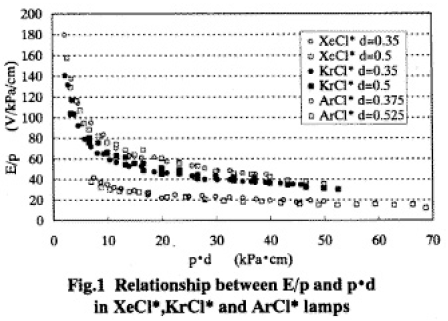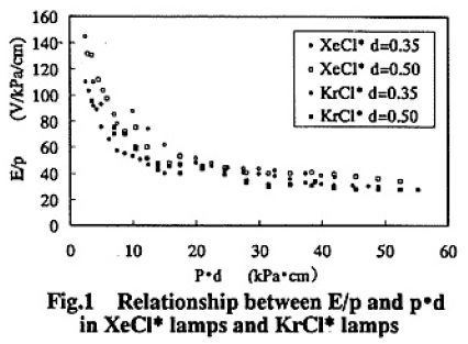 The value E/p is plotted as a function of pd in Fig.1.It may be shown for E/p to depend upon pd,not d.The difference in E/p between Xe/Cl2 lamps and Kr/Cl2 lamps is very small.If the breakdown voltage is used in place of E/p, this relation is similar to Paschen’s curve.