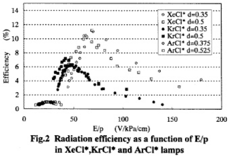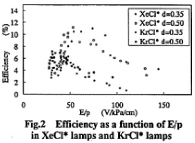 Fig.2はE/pと効率の関係である。低いE/pでは原子を励起させるのに十分なエネルギーを得られないために急激に効率が低下し、高いE/pではエキシマを生成する励起準位よりも高い準位まで励起される原子が多くなるために効率が落ちると思われる。よってエキシマを生成するのに効率のいいE/pが存在する。