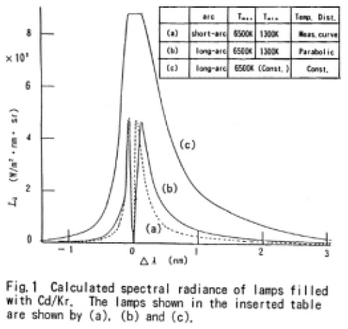 Calculated spectral radiances of the resonance line of Cd+ (214.4nm)from a short-arc lamp as well as from long-arc lamps are shown in Fig.1.Both of a parabolic distribution and a constant distribution were assumed for the temperature inside the lamps.The distribution measured by H.Burck et al.2)was used for a short-arc lamp.This calculation has been done using the quasi-static approximation of line broadening.The ratio of LT of the long-arc lamp with the parabolic distribution to that of the lamp with the constant temperature is 0.258.which is as large as twice compared with that of NaD lines of HPS lamps filled with Xe gas.The high ratio due to less self-absorption is shown.According to the reference1) the resonance radiation at 228.8nm of Cd atom in the short-arc lamp is not observed except in the far wing.This is a piece of evidence of high radience of ionic resonance lines from the lamps.