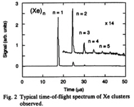 Fig.1に実験装置を示す。実験装置は希ガスクラスタを生成する超音速ジェット用とクラスタの質量数別スペクトルを測定する飛行時間分析用の2つの真空チャンバから成る。超音速ジェット用真空チャンバ内にはステンレス製コニカルノズル(口径0.3mm,半値閉口角45度)と自動車用燃料噴射装置を組み合わせた超音速ジェット装置を取り付けている。希ガスは4msの噴射時間のパルスジェットにより供給した。この噴射時間は真空ポンプの容量により制限されている。希ガスはキセノンガスを用いた。ノズルから噴射されたキセノンガスジェットは10mm下流のスキマー(口径1mm)を通して真空度10 -7Torrの飛行時間分析用真空チャンバ内(ジェット噴出時圧力10-5Torr)に導入した。この真空チャンバの中心に設置してある電極間において,キセノン原子及びクラスタはYAGレーザーの4倍高調波(波長266nm,エネルギー2mJ)によって3光子電離し,イオン信号を飛行管上部に設置したマイクロチャネルプレート(MCP)によって検出した。Fig.2はMCPからの信号強度の時間依存性である。横軸は飛行時間で質量数に対応し,縦軸はイオン信号強度に比例する。Fig.2よりn=8までのクラスタが生成し,その大部分はXe2であることが確認された。
