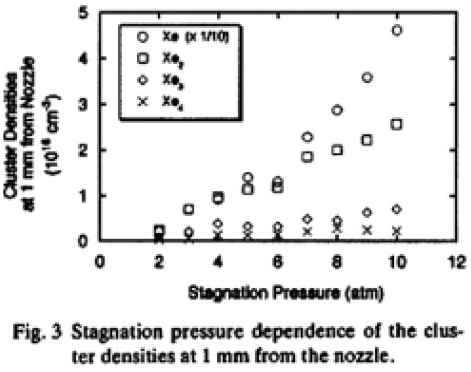 パルスジェットではノズル噴射後のガス密度は,背圧から見積られるガス密度と同じではないことがFig.3よりわかった。本実験における三体衝突によるキセノンエキシマの生成率は,k1=10-32cm6 s-1 13)を用いると背圧10atmにおいて約106s-1 である。一方,キセノン準安定状態からのクラスタの生成率は同じ圧力で108s-1 程度(k2=10-10cm3s-1を用いた14))とより高い生成率となっていることがわかる。