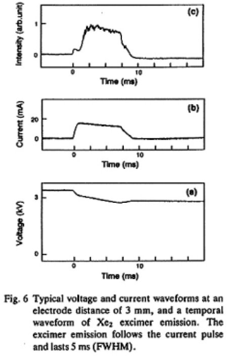 Fig.6のスペクトルから求めた中心波長176nmのキセノンエキシマ光のバンド幅は8.3nm(半値)であった。この値は電子ビーム励起の場合の値(12nm 10))と比べて著しく小さく,キセノンエキシマの低い振動温度(約250K 11))が反映されている。この放電においては,ピーク電流値mA程度が5ms持続することから安定なグロー放電が得られていると考えられる。このときの電流密度は最も大きい場合でも数十Acm-2程度であり,電極材料に起因するスペクトルあるいはキセノンイオンのスペクトルは観測されなかったことから電極材料の放電によるスパッタリングの影響はなく,また電子温度も平均数eV程度であると推測される。