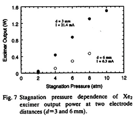 放電電極間距離を減少させた場合のエキシマ発光強度の増加は,励起密度の増加に加えて,超音速流がターミナルマッハ数に達する位置,すなわちクラスタの成長が完了しその密度が最も高い位置に電極を配置したことの影響も考えられる。Fig.7に示しているように,ノズルの背圧10atmにおいて絶対出力を見積ったところ,波長172nmにおいて最高出力1.5Wとなり,そのときの効率は3.0%であった。またこの値から見積られるキセノンエキシマ密度は約1015~1016cm-3であった。(放電体積の見積もりにより1オーダー程度不確定である)生成されているクラスタの密度が電極の位置において約1018cm-3のオーダーであることを考えると,非常に効率のよいエキシマ生成が実現していることがわかった。
