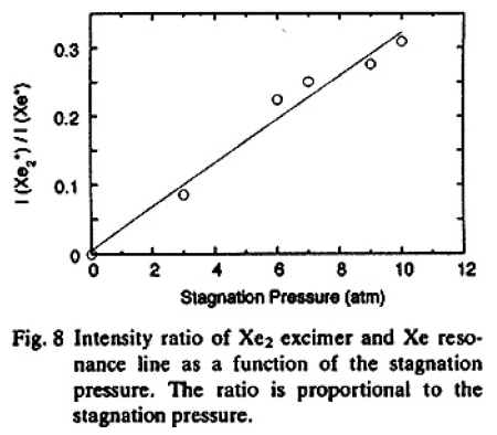 Fig.7の結果をFig.3の結果と比較すると,キセノンエキシマの発光はキセノンクラスタ生成数に比例していることがわかる。他の形状のノズル(ラバルノズル)を用いた場合でもクラスタ量の背圧依存性とエキシマ光強度の背圧依存性との間に強い相関があることが実験的に確認されている12)。これらの結果はクラスタの直接励起によるエキシマの生成機構を強く支持しているものと考えられる。
