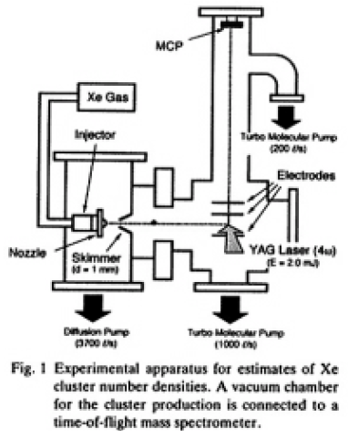 Fig.1に実験装置を示す。実験装置は希ガスクラスタを生成する超音速ジェット用とクラスタの質量数別スペクトルを測定する飛行時間分析用の2つの真空チャンバから成る。超音速ジェット用真空チャンバ内にはステンレス製コニカルノズル(口径0.3mm,半値閉口角45度)と自動車用燃料噴射装置を組み合わせた超音速ジェット装置を取り付けている。希ガスは4msの噴射時間のパルスジェットにより供給した。この噴射時間は真空ポンプの容量により制限されている。希ガスはキセノンガスを用いた。ノズルから噴射されたキセノンガスジェットは10mm下流のスキマー(口径1mm)を通して真空度10 -7Torrの飛行時間分析用真空チャンバ内(ジェット噴出時圧力10-5Torr)に導入した。この真空チャンバの中心に設置してある電極間において,キセノン原子及びクラスタはYAGレーザーの4倍高調波(波長266nm,エネルギー2mJ)によって3光子電離し,イオン信号を飛行管上部に設置したマイクロチャネルプレート(MCP)によって検出した。Fig.2はMCPからの信号強度の時間依存性である。横軸は飛行時間で質量数に対応し,縦軸はイオン信号強度に比例する。Fig.2よりn=8までのクラスタが生成し,その大部分はXe2であることが確認された。