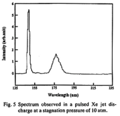 Fig.5に背圧10atmのときに測定したスペクトルを示す。ここではスペクトル強度の相対的な感度較正はされていない。波長135nmから235nmの間で観測されたピークは,中心波長176nmのキセノンエキシマ及びキセノン原子の共鳴線(波長147nm)のみであった。
