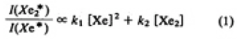 観測されたスペクトル(Fig.5)よりエキシマの生成には,準安定状態のキセノン原子が強く関与していることがわかる。準直流グロー放電中での電子温度を数eVとすると,電子によるクラスタの直接励起に比して,キセノン原子の準安定状態を介したエキシマの生成機構が優勢であると考えられる。そこでエキシマ生成機構として,準安定状態のキセノン原子による通常の三体衝突生成反応とこれによるクラスタへのエネルギー移乗反応とを考えると,キセノンエキシマとキセノン共鳴線との強度比は定常状態では次のように表される。(Xe*6S[3/2]01)と6S[3/2]02(準安定状態)の数密度は等しいと仮定している。またジェットによる媒質の供給により共鳴線の再吸収は無いと仮定している。)