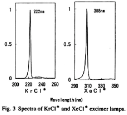 放電ガスをそれぞれ,Ar.Kr,Xe,KrCl,XeClを選ぶことにより126nm,146nm,172nm,222nm,308nmの5波長が得られる。126nm,146nmランプは照射窓にMgF2を用いている6, 7)が他ランプの照射窓は石英ガラスを使用している。発光スペクトルはほぼ単色光である。Fig.2にAr,Kr,Xe20W型エキシマランプの分光分布を示す。半値幅は10~14nmである。比較のため,重水素ランプ(30W)の分光スペクトルも示してある。エキシマランプのランプ電力が20W,重水素ランプが30Wと,後者の方が大きいにもかかわらず,エキシマランプの方が大きな出力が得られている。XeCl*,KrCl*タイプの分光スペクトルをFig.3に示す。中心波長がそれぞれ,308nm,222nmで,半値幅が2nmの単色光に近い分光分布を持つ。放電ガスを選択することで,他の波長のエキシマ発光を得られることが,実験的に報告されている3)。