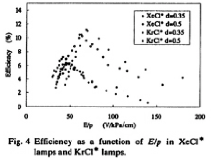 放電ギャップの大きさとキセノンガスの圧力を変えて,エキシマ光の発光効率を調べた(Fig.4)。ここでエキシマ光の全放射束の絶対値をランプへの入力電力で除した値を発光効率と定義した。電界強度Eをキセノンの圧力pで除した値E/pは,放電プラズマ中の電子のエネルギー,従って発光効率に関係すると考えられる。得られた結果をE/pで整理した結果,発光効率はE/pが約40から70V/cm/kPaにおいて最大になり,効率の絶対値はXeClで約11%,KrClで約8%であった8)。なお,供給電力密度は,現在,約0.25W/cm2である。今後,構造,冷却方法の最適化により,10倍程度まで入力密度を上げることは可能と考える。