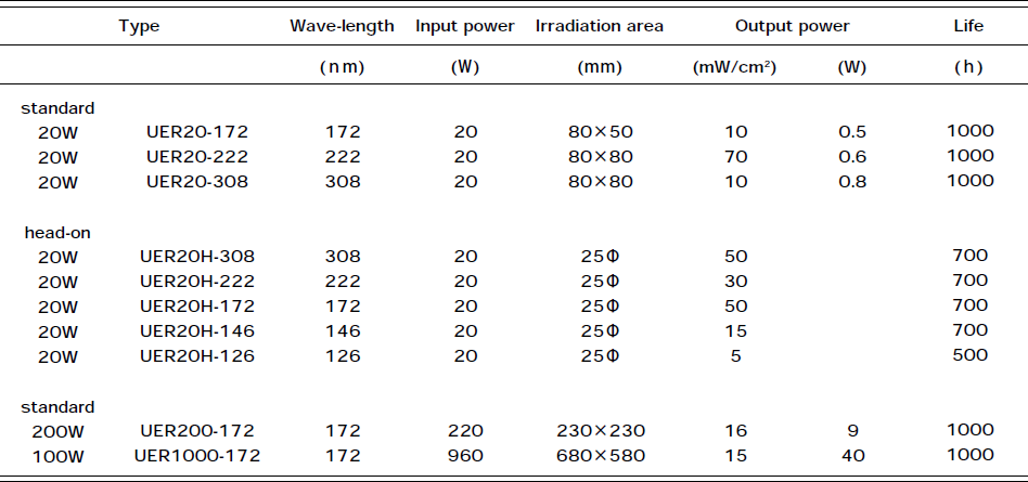 Table 1 に照射装置の種類とそれぞれの仕様を示す。電力20Wタイプはランプと照射ユニット形状により,標準型とヘッドオン型に分けられる。また,照射面積が大きい200Wタイプ,1000Wタイプも開発されている。