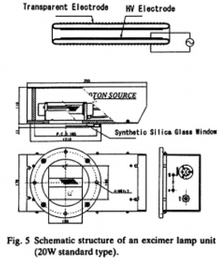 Fig.5にランプの概略図を示す。外側管の側面から光を取り出すために外側電極を光透過性の金属網電極にした構造の管状ランプである。ミラーを装着し,照射ユニットとしており,内部は,オゾンの発生,エキシマ光の酸素への吸収を防ぐため,窒素パージしてある。
