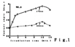 ポリイミドフィルムに水を一滴たらし、その上から石英ガラスをかぶせることによって、毛細管法により数十µmの液層を、ポリイミド・石英ガラス間に形成させ、その上から真空紫外ランプを0~15分間照射した。これによって、改質された試料の親水性を、水との接触角の測定から評価した。その接触角のランプ照射時間依存性をFig.1に示す。この図から、172nmのランプ光を照射したほうが接触角が小さく、よく改質されることがわかった。