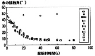 2-プロパノール処理後の無アルカリガラスをAir中で点滅点灯(ON-OFF比、周波数)とAir中とN2中で連続点灯で時間を変化させて洗浄した。評価は水の接触角により行った。