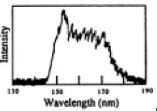 放電部は内径1.5cm、励起長50cmの円形石英管をアルミ電極が挟み込む形になっており、容量 0.7µFのコンデンサに最大 22kVの直流電圧を充電し、パルス放電を行う。Fig.1はKr260Torr、Xe35Torrの混合気体を無声放電励起した時に得られたパルス幅1.5µs、波長帯域 25nmの広帯域スペクトルである。