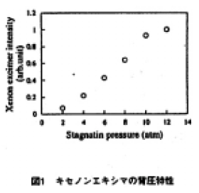 今回、この点に着目して、クラスタ密度とクラスタ噴射時間を制御することで、任意の光強度と発光時間を容易に選べるキセノンエキシマランプの開発を試みた。ジェットノズル内ガス圧がクラスタ密度に適切に依存し、かつ時間応答の早いガスジェットが得られるようにジェットノズルとガスインジェクターからなるジェット噴射装置を製作した。その結果、ガス背圧に線形なエキシマ光強度特性が得られ(図1)、容易にエキシマ光強度を変化させることができた。また、ガスジェット噴射時間を制御することで発光時間(<数十ms)を任意に変化できた。この時の印可電圧は3kV、放電電流は5~13mAであった。
