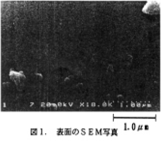 TEOS(珪素アルコキシド)を10Torrの圧力で満たしたチャンバー内で室温、照度10mW/cm2でサファイア基盤を約5時間照射したところ5時間照射したところ5時間照射したところ5時間照射したところ、基盤上に無色透明な薄膜状の物質が約250nm堆積した。表面のSEM写真を図1に示す。FT-IR測定でこの薄膜中には Si-O-Si 伸縮運動の強いピークが見られ、石英膜が生成されていることが確認できた。得られた薄膜について物理的、光学的特性を調べており、あわせて当日報告する予定である。