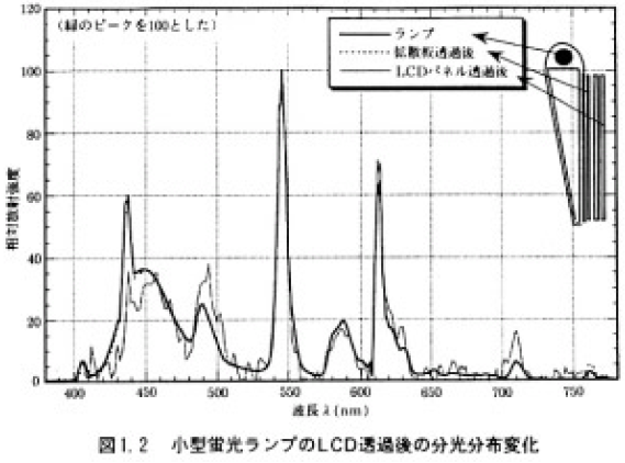 一般に,蛍光ランプの発光スペクトルは,カラーフィルターと導光板のアクリルなどにおける吸収により,青の波長域で大きく減衰し(図1.2),利用率が悪くなる。このため,カラーLCDに使用される蛍光ランプの発光スペクトルは,蛍光体の配合比により,青の波長域の強度をあらかじめ上げておくことが必要である。実際,色温度に直すと10000K付近で設計されることが多い。また,2W以下の低消費電力で,輝度の高いランプが要求されているので,より発光効率の良いランプでカラーフィルターとのマッチングがはかられる。