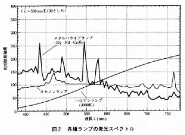 図2に示すメタルハライドランプの発光スペクトルは,LCDプロジェクターのバックライトとして使用されている代表的なDy-Nd-Cs系ランプの例である。連続スペクトル分布を有し,色温度が7500K、発光効率が75lm/Wである。