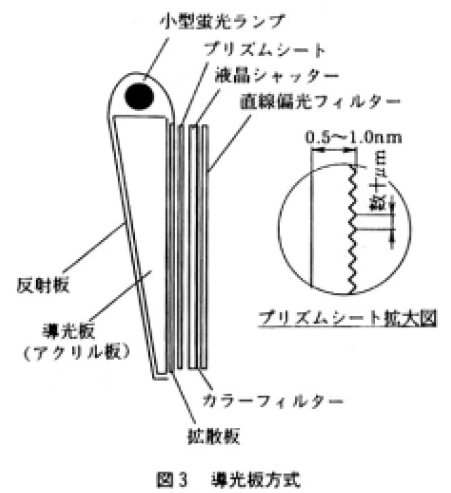 近年,パソコン,ビデオカメラ等では,エッジライト方式(導光板方式)が主で,他の分野もこれに同調しつつある。一部の用途で,直下型のバックライトが用いられておりこの場合,多くは,U型やW型等の異形ランプである。LCDバックライトとして蛍光ランプを使用する場合,光学系は,一般に図3に示す導光板方式が用いられる。導光板方式は,蛍光ランプからの光を反射ミラーによって透明のアクリル板に入射させ,アクリル板中での反射を制御して導光板前面に出射させる方式である。導光板方式では、ユニットの出射面にプリズムシートを入れ光の指向性の制御を行うことで,見かけ上の導光板ユニットの光の利用率は100%近くにまで達している。
