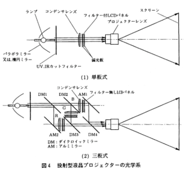 投射型カラーLCDでは,図4に示すように単板式と3板式の2方式がある。いずれもランプからの光は,ミラーまたはレンズにより効率よくLCDパネル面に集められ,投射レンズによりスクリーン上にその像が投影される。