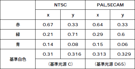 表1 カラーテレビジョンの方式と三原色及び基準白色の色度座標