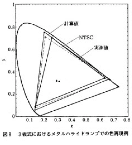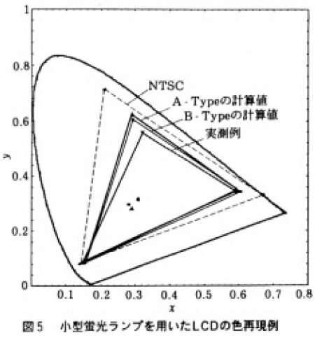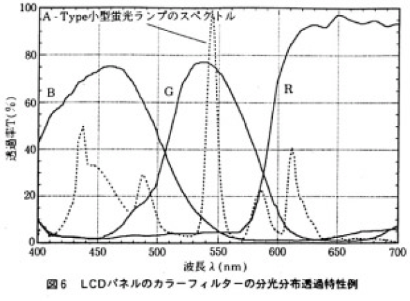 また,3節で述べたようにLCDの直視型,投射型にかかわらず,色再現は,色分離フィルターの分光透過とランプの発光スペクトルに大きく依存しているのでお互いのマッチングが必要である。さらに,設定白色の色温度に合ったRGB出力の理想的な3波長型光源でない限り,色再現と明るさはトレードオフの関係にあり,どちらを優先させるかを選択し,バランスをとることが必要である。