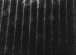 様々な圧力および雰囲気下においてキセノンエキシマランプ(ウシオ電機製 : 波長172nm、照度10mW/cm2)で照射したサンプルを、光学顕微鏡、FT-IR、SEMなどで評価を行った。サンプル表面にスリット状の金属マスクを置いて、40分間照射を行ったPMMA表面の顕微鏡写真をFig.1に示す。エッチング速度は、雰囲気ガス種、圧力に影響を受けるが、最大で7.5nm/minであった。他の材料についても同様の測定を行っており、それらの反応メカニズムなどと合わせて、詳細は当日報告する予定である。