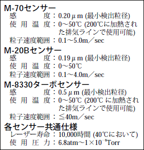 アプライドマテリアルズ社のメタルエッチャー専用に開発された新センサーである。新しい検出方法を採用しており、チャンバー内のプラズマ光のある場所でも測定が可能である。センサーの検出感度は0.5µmであるが、ターボポンプ上方のスロットルバルブ部の効率の良い位置で検出できるので、チャンバー内の汚れやトラブルを効果的に測定できている。尚、本製品はAMAT (USA)社との共同開発によるもので、センサー取付のためのフランジは同社より購入できる。