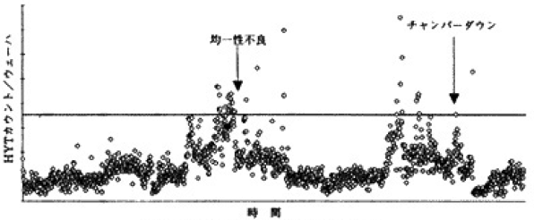 第1図は約4週間にわたる測定例であるが、装置内のパーティクルレベルに対応した各ウェーハ毎のデータが得られている。