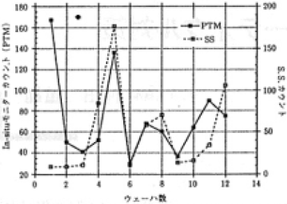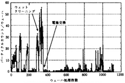 その1例として第7図に示すように、製造ラインにおいてロット間の休止時間が長い場合に、処理再開直後に粒子数が急増する現象も観測した。この現象の詳細な原因は不明であるが、いつも現れるのではなく種々の要因が重なった場合に生じている。