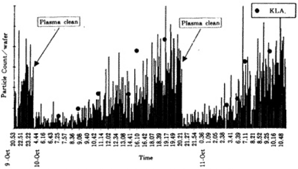 以上述べたように実際の製造時のパーティクルレベルは、装置の汚れ具合の他にプロセス条件、膜種、装置の運転状況等が複雑に影響しており、突発的に多くのパーティクルが生じることも多い(7)。この様な場合定期的なミラーウェーハによるチェックでは検出が困難であり、実プロセス中のパーティクルを連続でリアルタイム測定することの重要さが分かる。