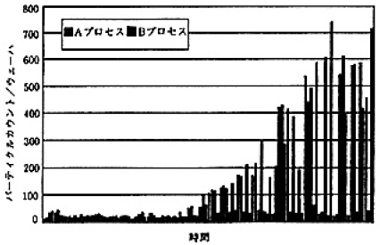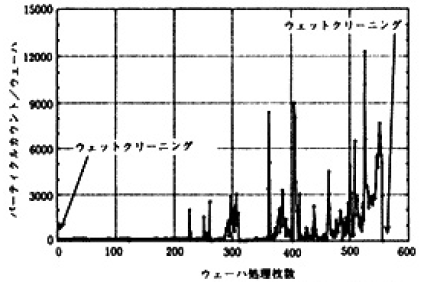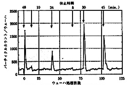その1例として第7図に示すように、製造ラインにおいてロット間の休止時間が長い場合に、処理再開直後に粒子数が急増する現象も観測した。この現象の詳細な原因は不明であるが、いつも現れるのではなく種々の要因が重なった場合に生じている。