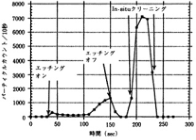 第10図に示す様にin-situクリーニング時には、エッチング時に比べても効率良く多くのパーティクルをカウントをしている。実際にウェーハが処理されているという点ではエッチング時のカウントがより重要である。しかしエッチング時のパーティクル増加を引き起こす潜在的な要因としてのチャンバー内の汚れを効果的にモニターできるという点で、in-situクリーニング時にin-situモニターで検出することは今後有効な方法になると考えられる。