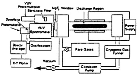 希ガスエキシマスペクトルは、焦点距離20cmの真空紫外分光器及びシンチレーター付き光電子増倍管により検出した。発光スペクトルは、分光器を波長掃引することにより光電子増倍管とプロッターにより測定した。また希ガスエキシマ発光の絶対強度測定は、感度較正されたバンドパスフィルター(Acton社製)及び、感度較正された光電子増倍管により測定した。放電電圧の測定は高圧プローブを用い、放電部への入力電力はV-Qリサージュ図形より求めた[4]。