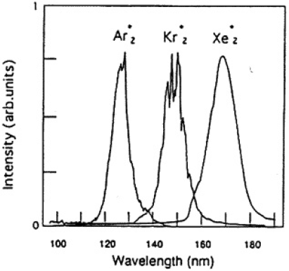 Fig.2 Observed rare gas excimer spectra in a high-frequency silent discharge. VUV emission from three defferent excimers are shown together for comparison. The relative intensities of these continua are normalized.