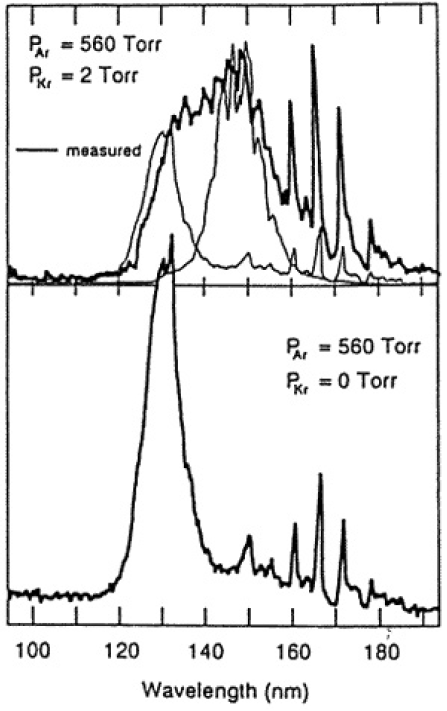 観測された広帯域スペクトルの短波長側は、2Torr添加されたクリプトン原子の共鳴吸収(波長125nm)により制限されている。また波長160nmより長波長側でのスペクトル幅の拡がりは下図に見られる3本のアルゴンイオンラインの強度増加により見かけ上拡がっている。発光帯域の中心波長近傍からわかるように、この広帯域スペクトルは、Ar2*、Kr2*スペクトルの線形和では説明がつかない。