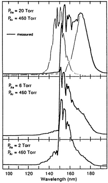 同様の実験をクリプトン無声放電中にキセノンを添加することにより行った。その結果をFig.4に示す。このときの印加電圧は5kVであった。キセノン2Torrの添加により、キセノン原子の共鳴吸収のために147nmより短波長側が吸収される。キセノン分圧を上げることにより、波長172nm付近のXe2*強度が増加してくる。クリプトン460Torr、キセノン20Torrの混合ガスを励起したとき広帯域スペクトルが得られ、その半値幅は28.3nm(Δλ/λ0=0.17)であった。最上図には単独のKr2*、Xe2*スペクトルを細線で表している。この場合のスペクトルの拡張も、KrXe*(中心波長154nm)、Xe2*の第一エキシマバンド(波長150~160nm)に原因があると考えられる。