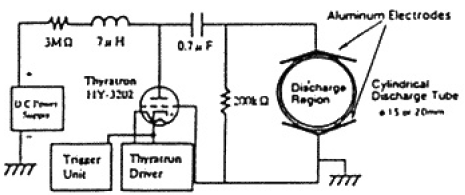 パルス動作無声放電では、高周波電源の代わりにサイラトロンスイッチを用いたパルス放電回路を用いた。Fig.5にパルス放電回路を示す。放電部は内径15mmもしくは20mmの石英管であり、長さは500mmである。容量0.7μFの充電コンデンサー(Maxwell社)を最大24kVの直流電圧により充電し、サイラトロンを0.2Hz周期でスイッチングすることによりパルス電圧を放電部に印加した。発行測定系はFig.1と同様である。電圧、電流はそれぞれ高圧プローブ、ロゴスキーコイルにより測定した。