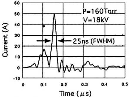キセノンガス圧160Torr、充電電圧18kVの時に得られた典型的な電流波形をFig.6に示す。サイラトロントリガー後、約100ns後のピークは、沿面放電によるものであり、約150ns後の半値幅25nsのピークは微小放電によるものと考えられる。このピークの後、回路形状により決まるリンギング電流が流れる。