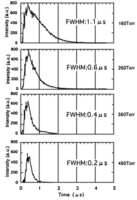 Fig.7に種々のキセノンガス圧でのXe2*の時間分解波形を示す。各々の波形は10ショット積算したものである。キセノンガス圧160Torrのときのエキシマの発光は放電電流開始後約4μsまで続いており、発光波形の半値幅(FWHM)は1.1μsとなった。圧力を増加させるとともにXe2*の電子による失活が顕著となり、圧力460Torrで半値幅は200nsとなった。この図から求められる発光波形の減衰時定数は、(0.2-0.7)μsなので、Xe2*の三重項からの遷移によりこれらの発光が支配されていることがわかる。
